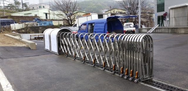 제주로 출고되는 제주도자바라대문은 높이 1200 길이 15미터 양개형이고 스텐하우스 2조 포함이면 우레우탄100파이 바퀴 모델입니다